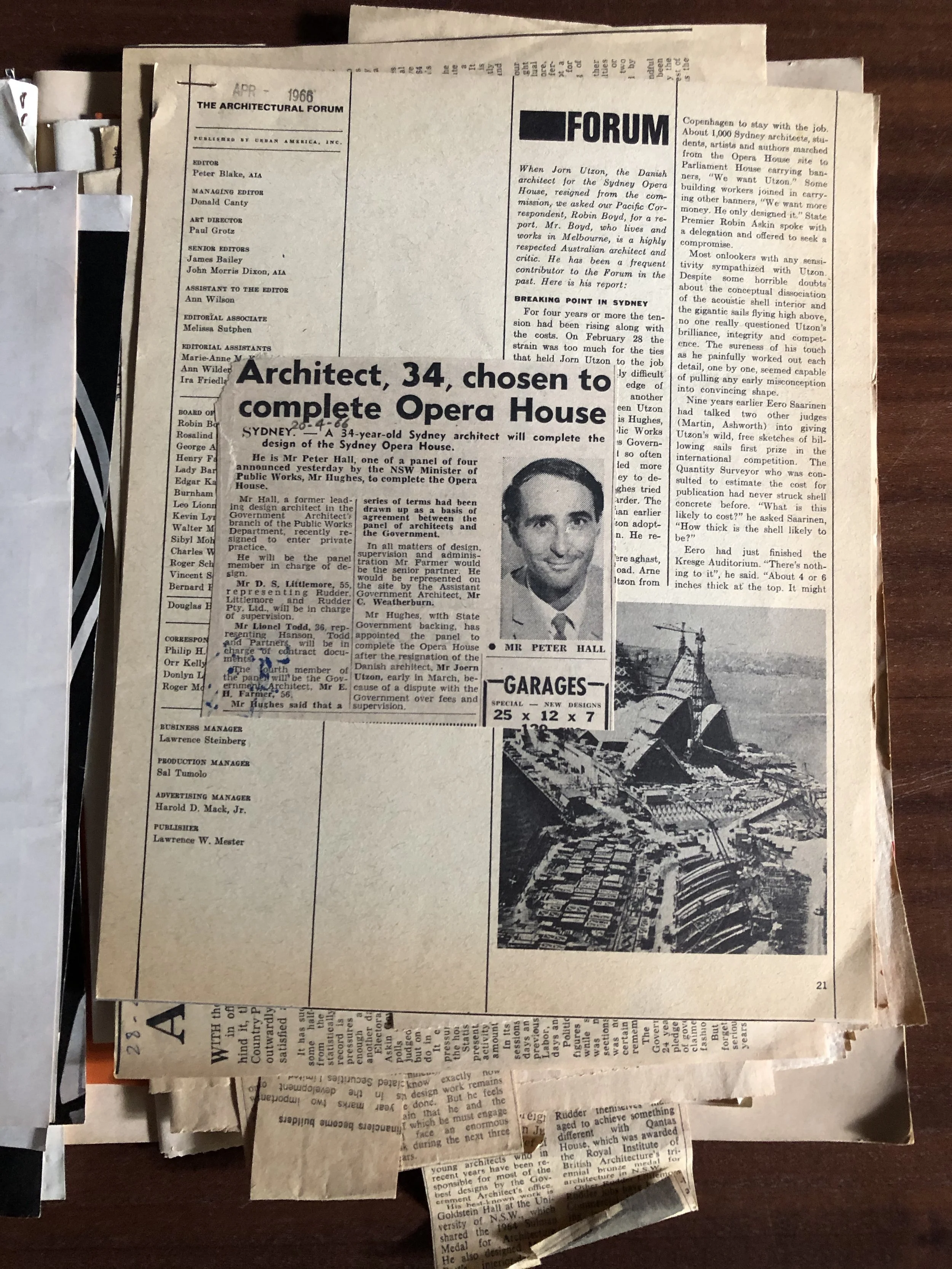 Robin Boyd held an extensive collection of material on the Sydney Opera House dating to the period after Jørn Utzon’s resignation in February 1966. Over forty assorted articles, essays and other material was inserted inside the front cover of April 1966 volume of Walkabout magazine. This issue of Walkabout features a cover article on the Sydney Opera House titled "‘Can You Cost a Dream?’ (pdf) by freelance architecture writer Eva M. Buhrich with images by photographer Max Dupain.